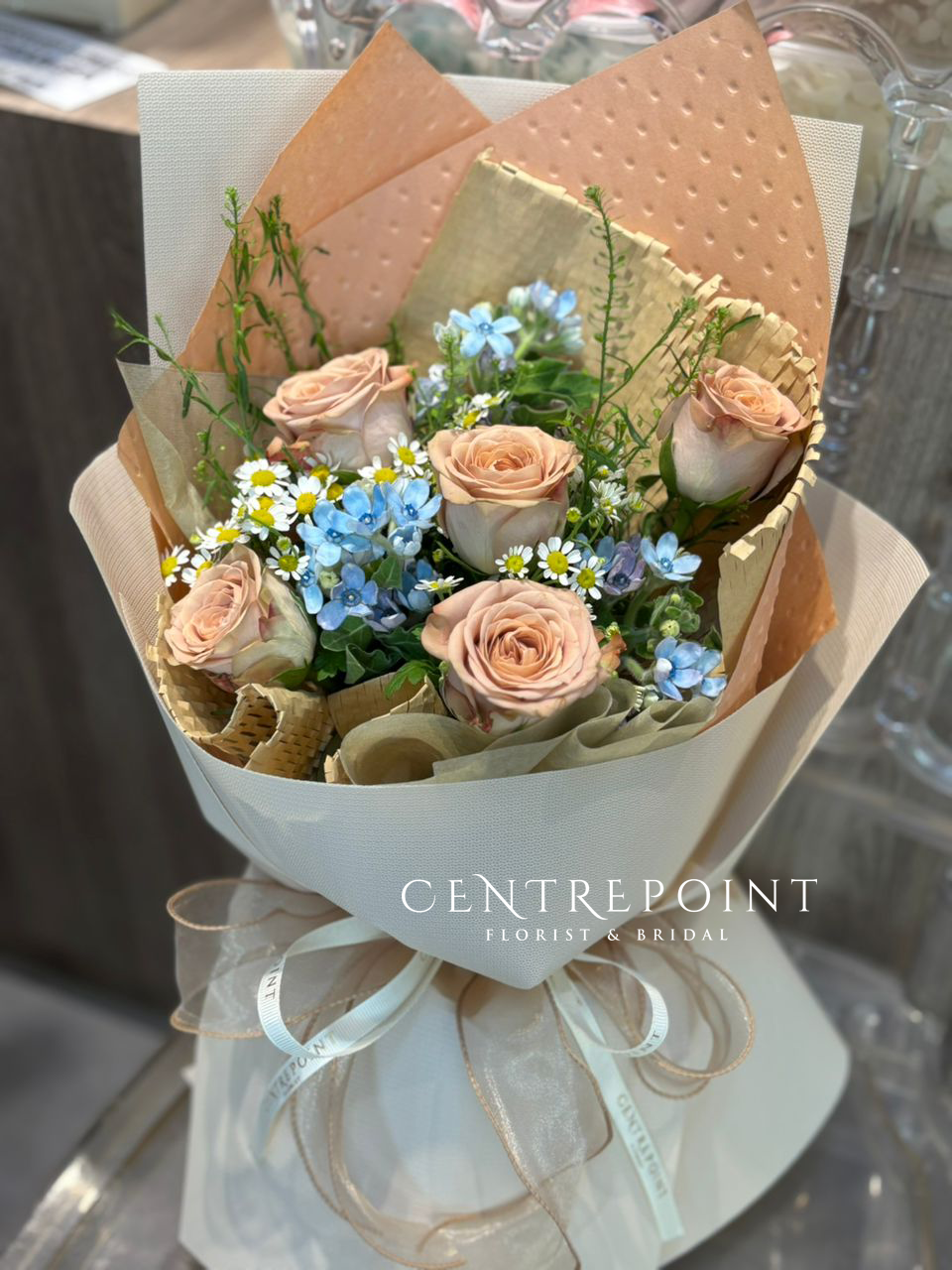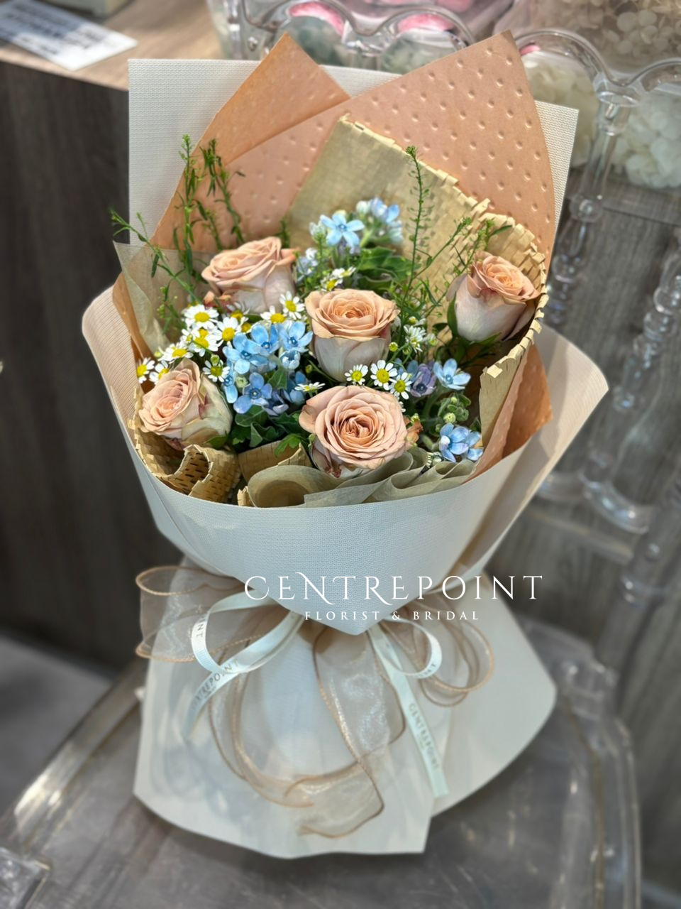 Flower : 5 stalks of capuccino roses and mixed fillers