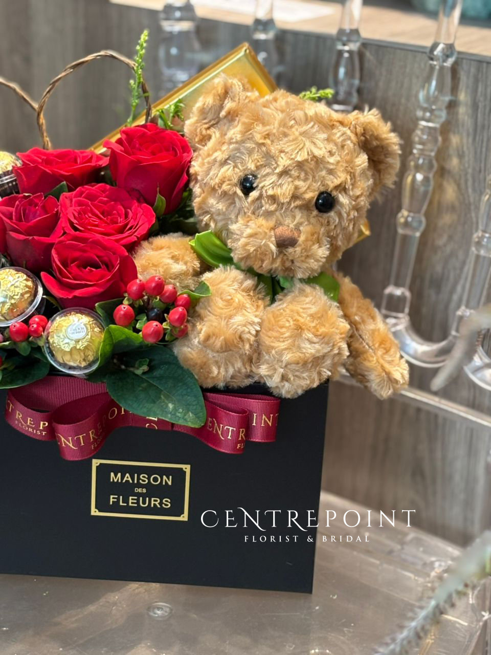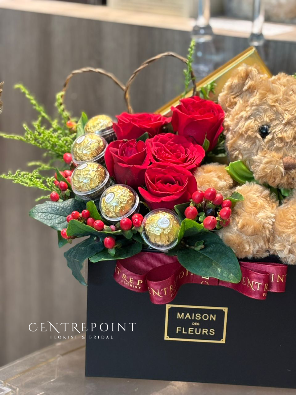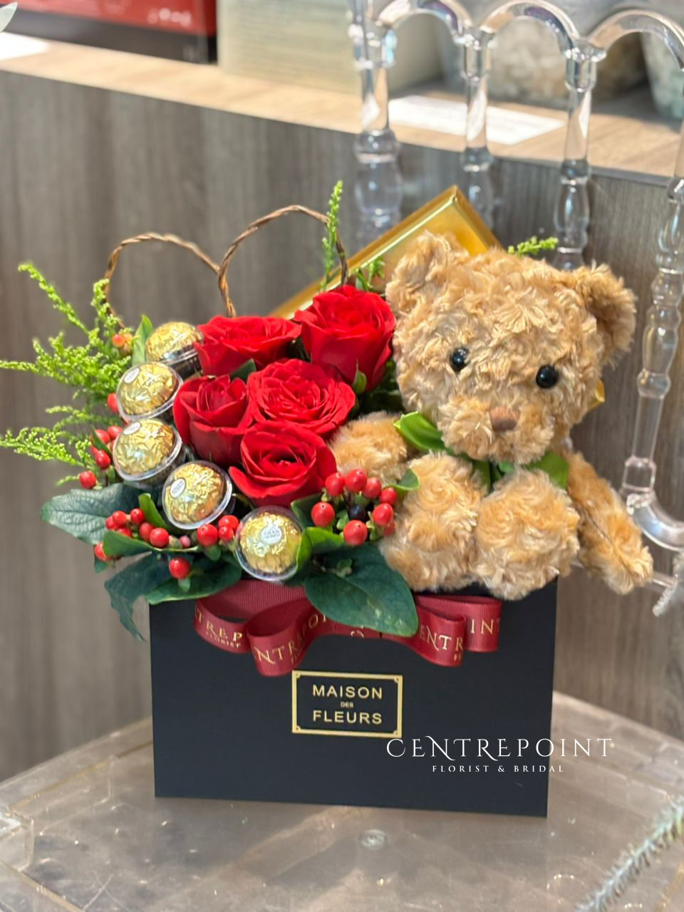 Flower : 5 stalk of red roses with medium teddy bear + 5 pieces of ferrero rochers.