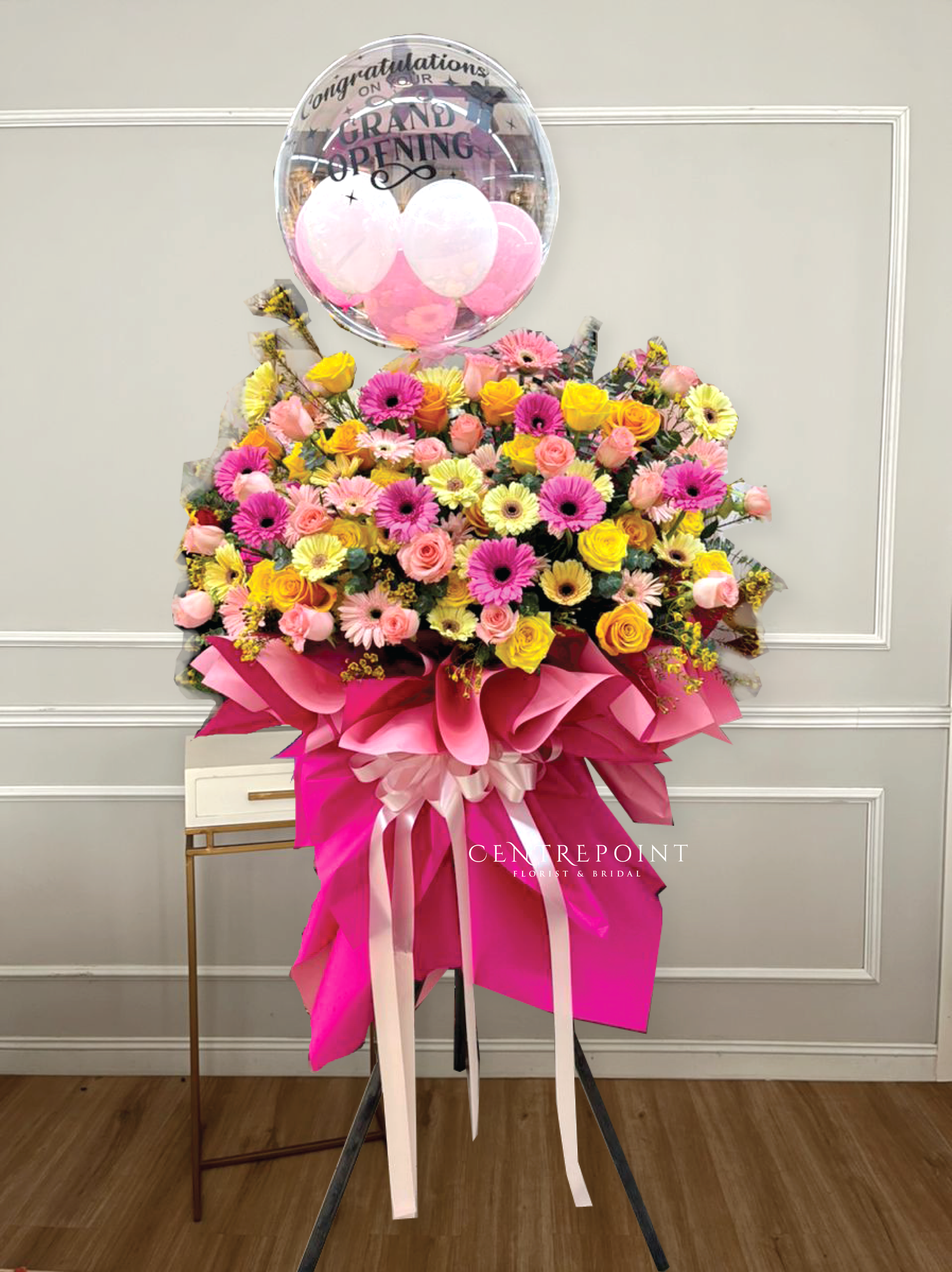 One layer congratulatory flower stand with special confetti balloon for any grand openings or happy ceremonies. Send your blessings and best wishes to the ones you care.