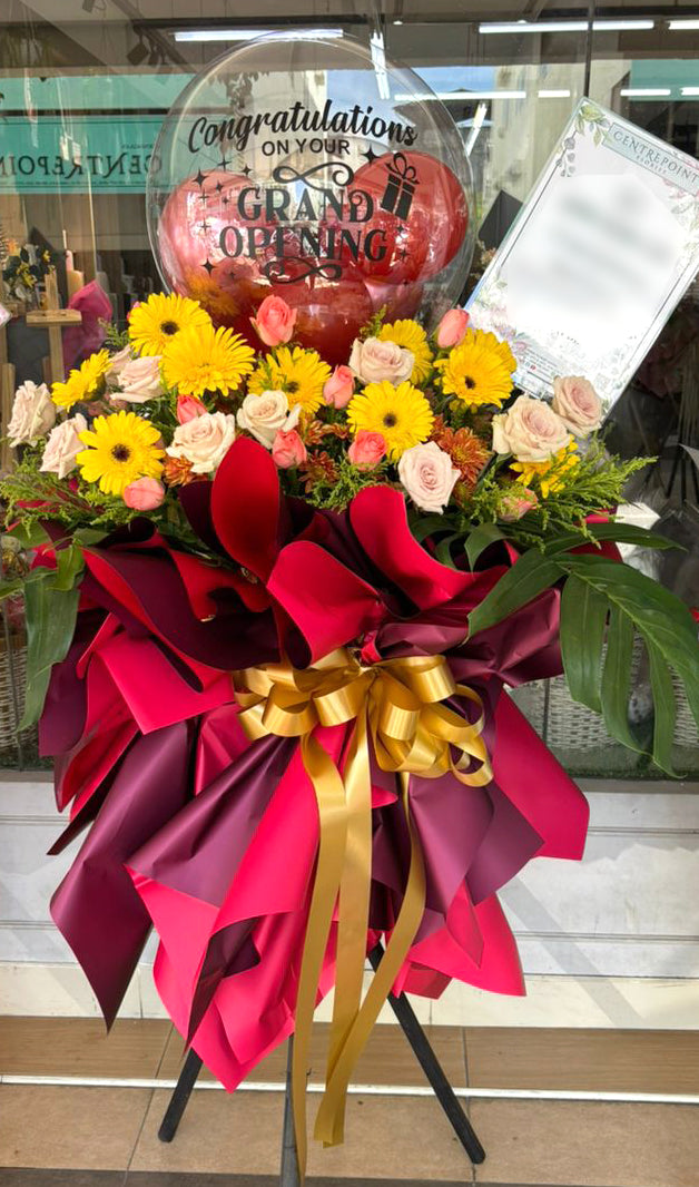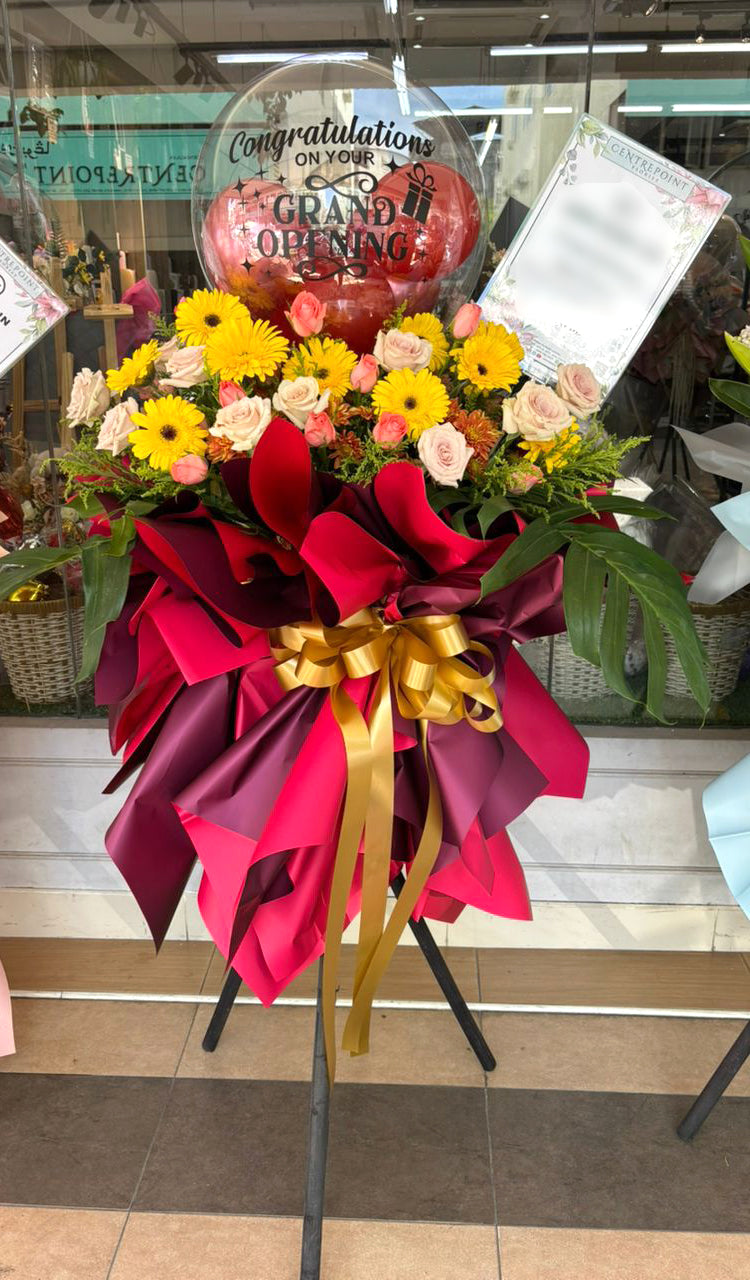 One layer congratulatory flower stand with special confetti balloon for any grand openings or happy ceremonies. Send your blessings and best wishes to the ones you care.